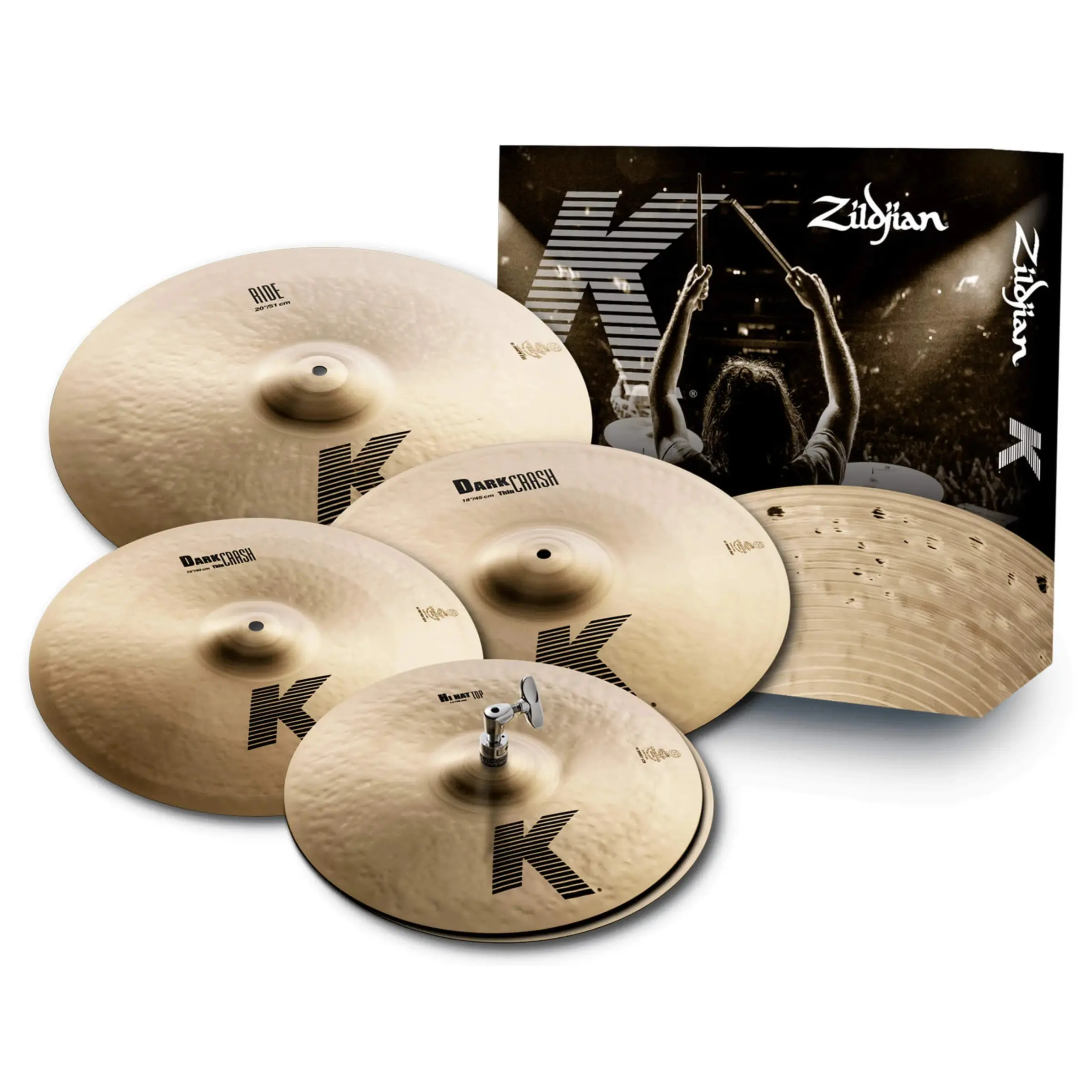 The Zildjian K Cymbal Set is a  perfectly matched set which includes a pair of hi-hats, two crash cymbals and a ride.