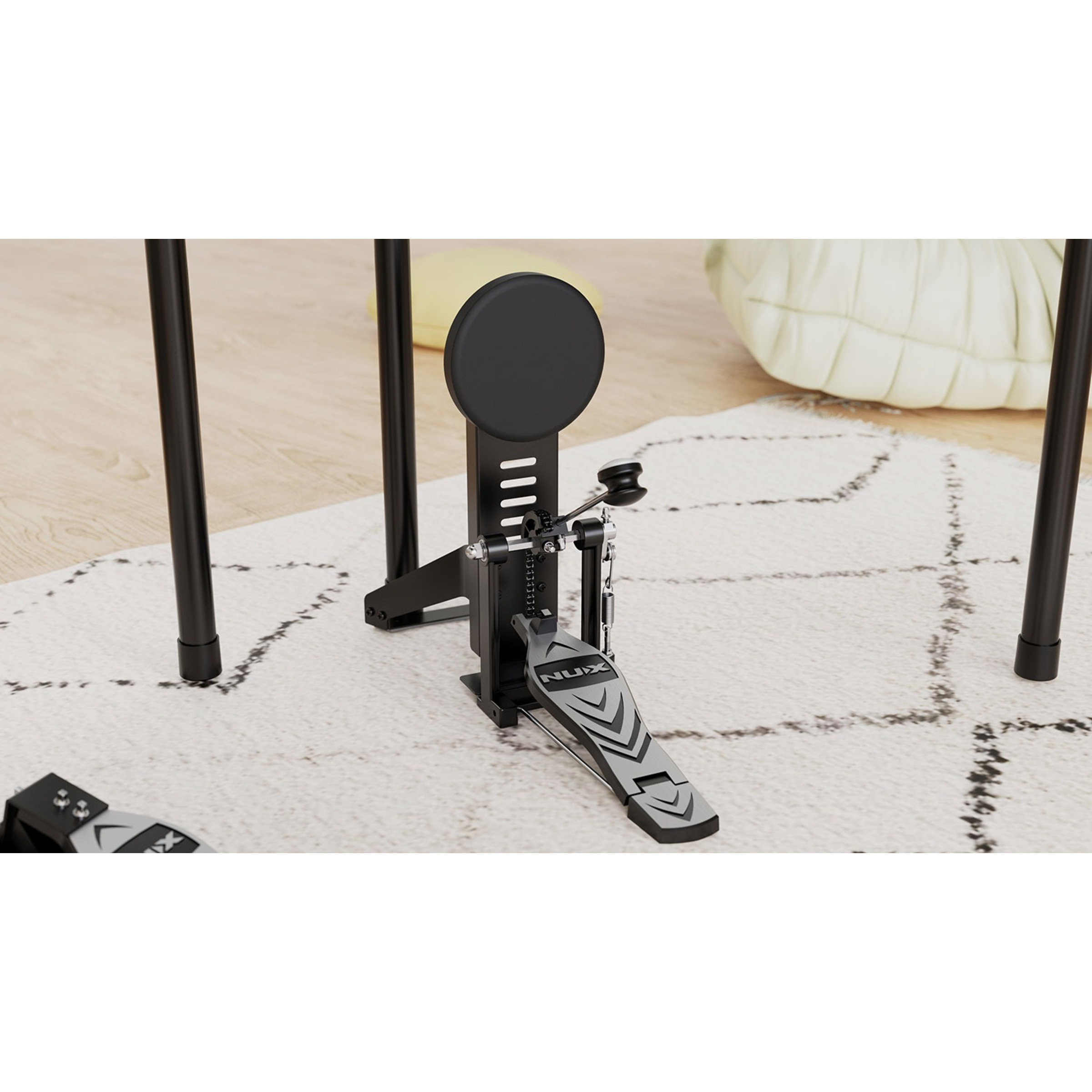 Continuing that point is the true-to-life kick pad (which is compatible with a double kick pedal if required), giving you the feel of actually hitting something and not just pressing a switch.