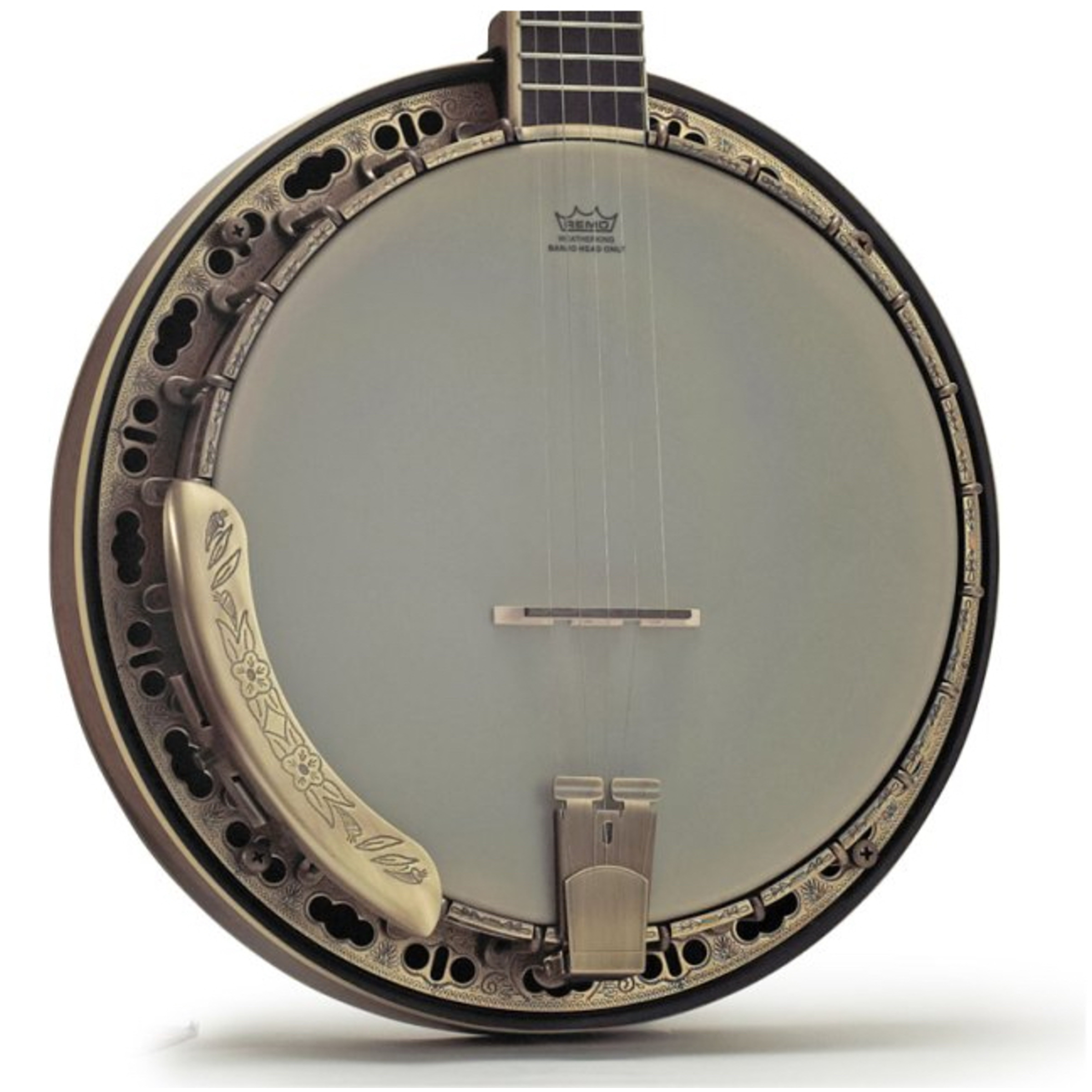 This high-quality banjo features a unique antiqued bronze coating with an engraved finish, making it ideal for bluegrass and various playing styles. It is constructed with a maple shell, neck, and resonator, along with 24 plated brackets.