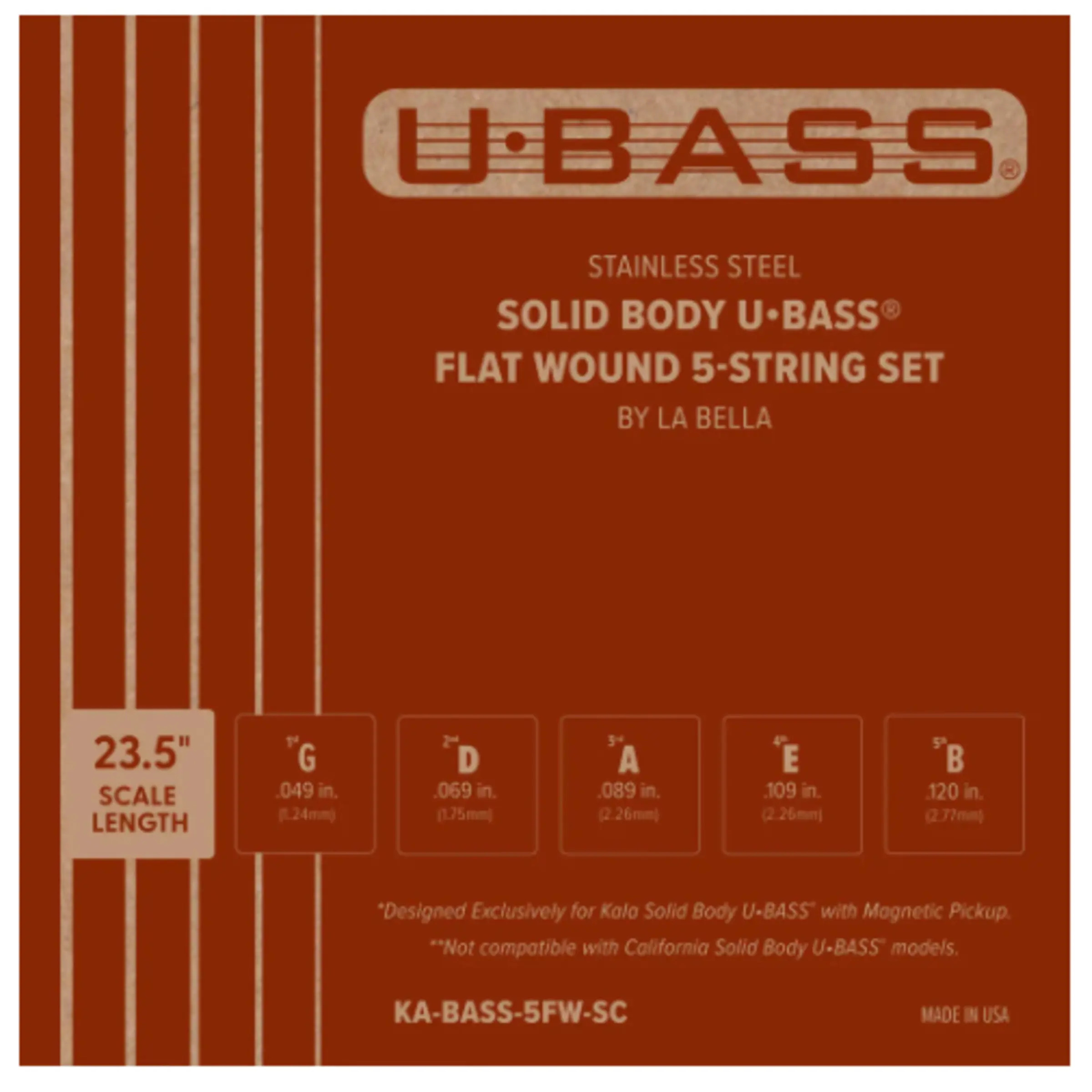 The Kala KA-BASS-5FW-SC Flat Wound Solid Body U-BASS 4-string set has been designed by leading string manufacturer La Bella and are specifically designed for the scale and magnetic pickups of the Solid Body U-BASS series.