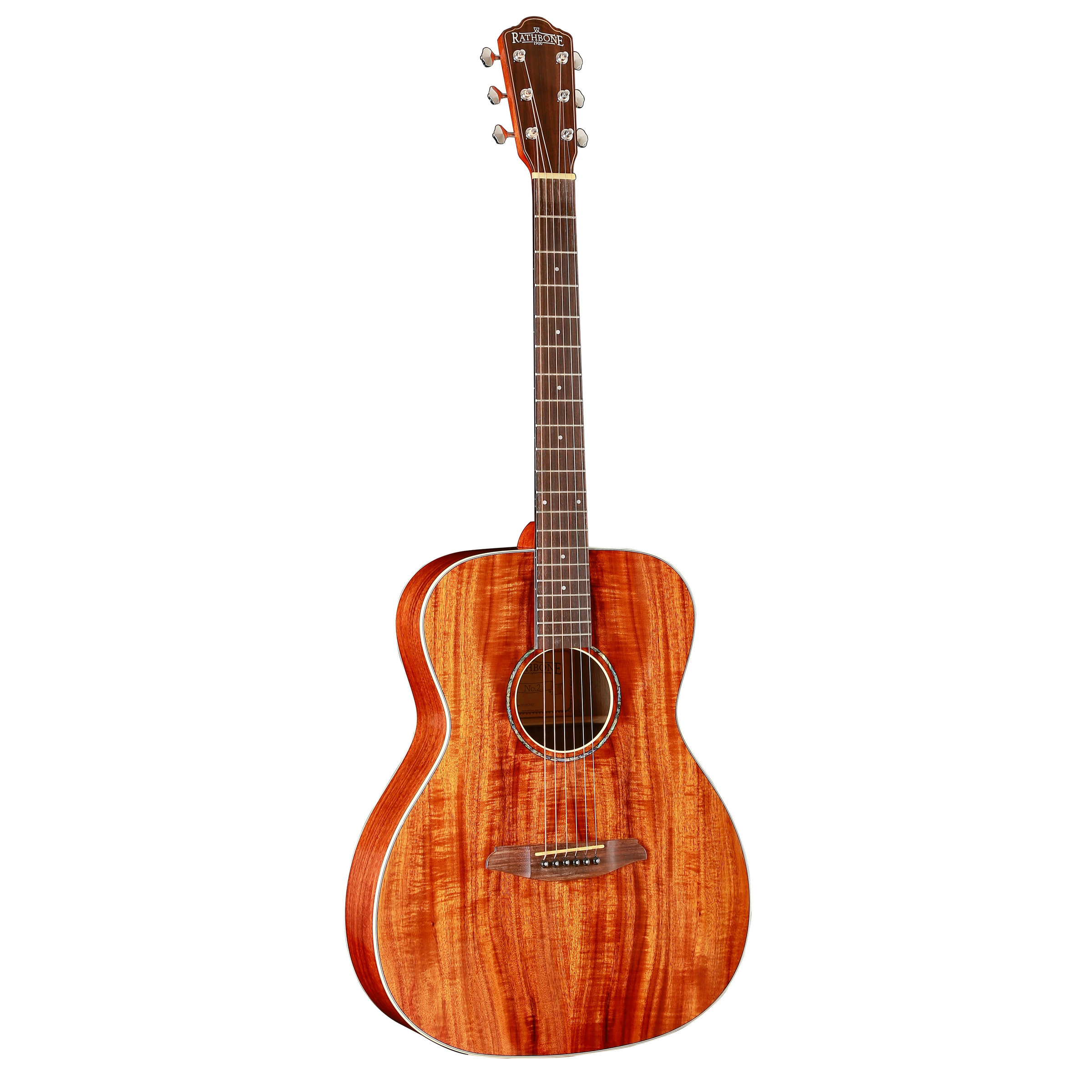 The Rathbone No.2 model features a technologically advanced sound-table made of two super-thin layers of Koa with a Carbon Fibre lattice in-between. This construction enables the sound-table to be a little thinner than a single solid piece of koa but remain strong and ultra-responsive. The result is a super-resonant and voluminous guitar with bags of both character and all-out power.