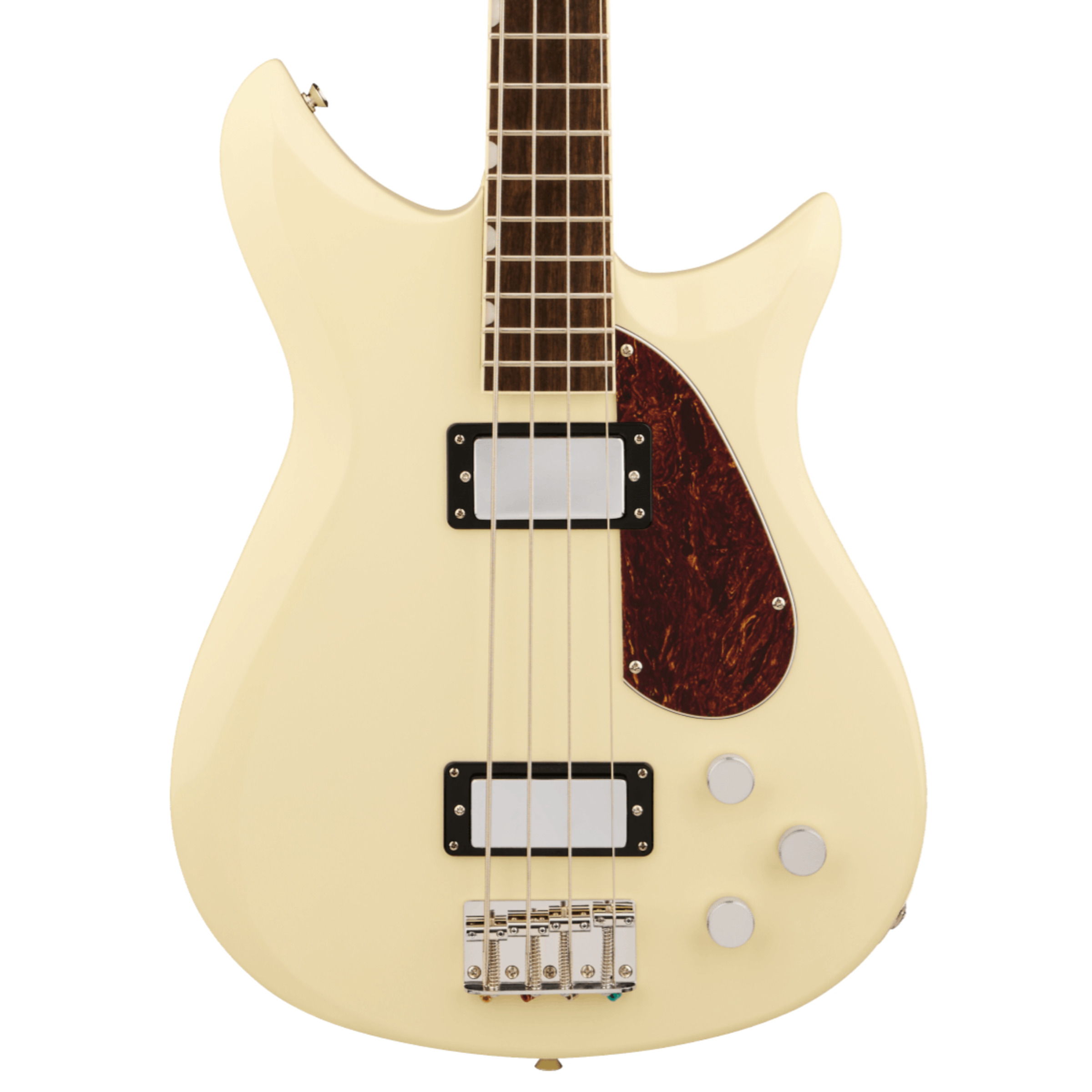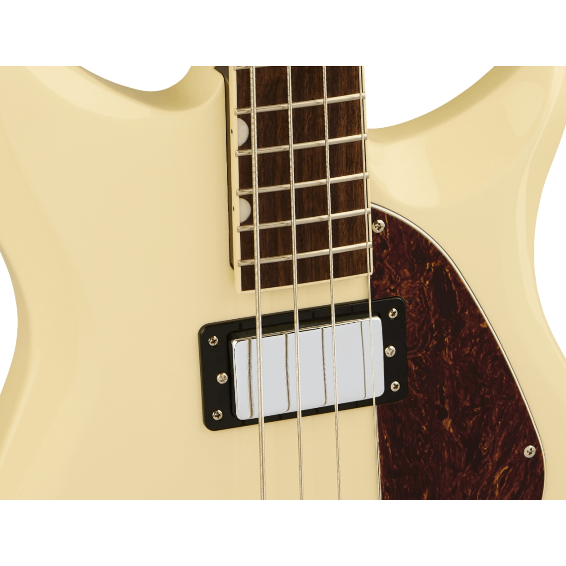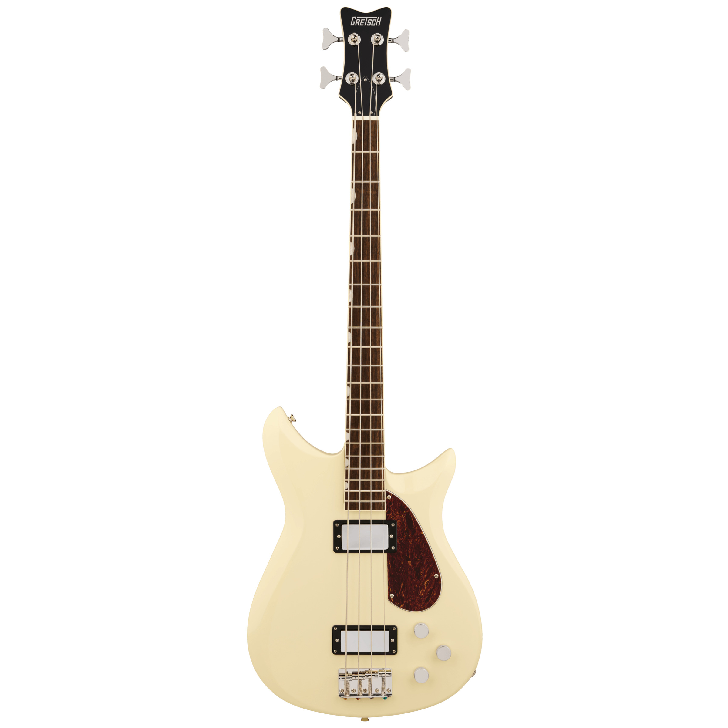 The body of the Electromatic CVT Bass Double-Cut is crafted from mahogany, complete with bevelled corners, adding to it cosmetic, retro charm. Paired with the body via bolt-on neck construction, is a mahogany neck with a short 32" scale. The neck is topped with a bound laurel fingerboard set with pearloid Neo-Classic thumbnail inlays and 20 frets.