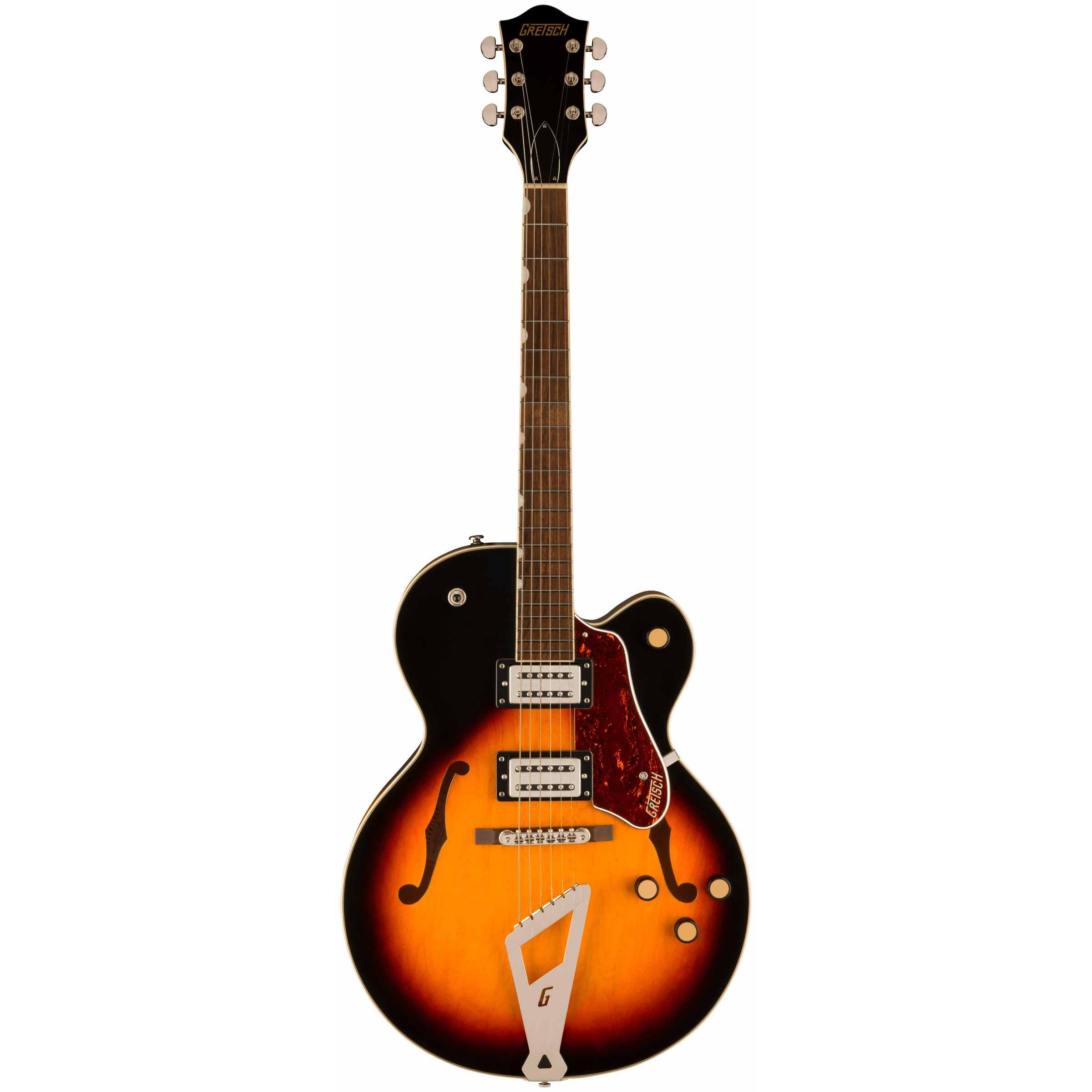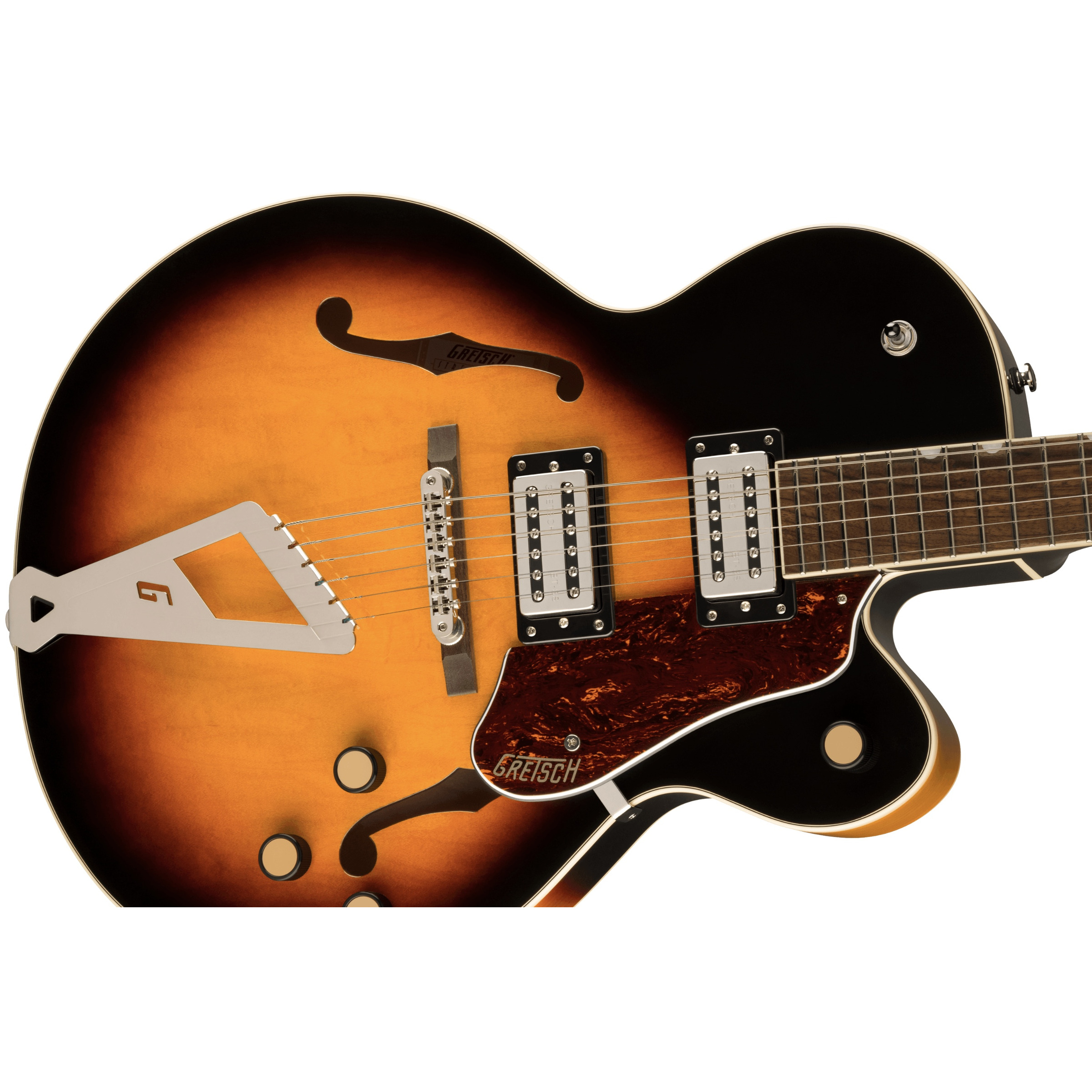 The Streamliner G2420s sound is delivered via new offering from Gretsch - the Broad’Tron BT-3S humbuckers. Gretsch have specially designed the Broad’Tron BT-3S pickups produce a tighter low end, crisp highs and a throaty midrange that will blend well in any band environment, from the studio to the stage. Master volume, master tone and individual pickup volume controls provide complete tone-shaping flexibility whilst the Push/Pull on the master volume control gives even more tonal variety!