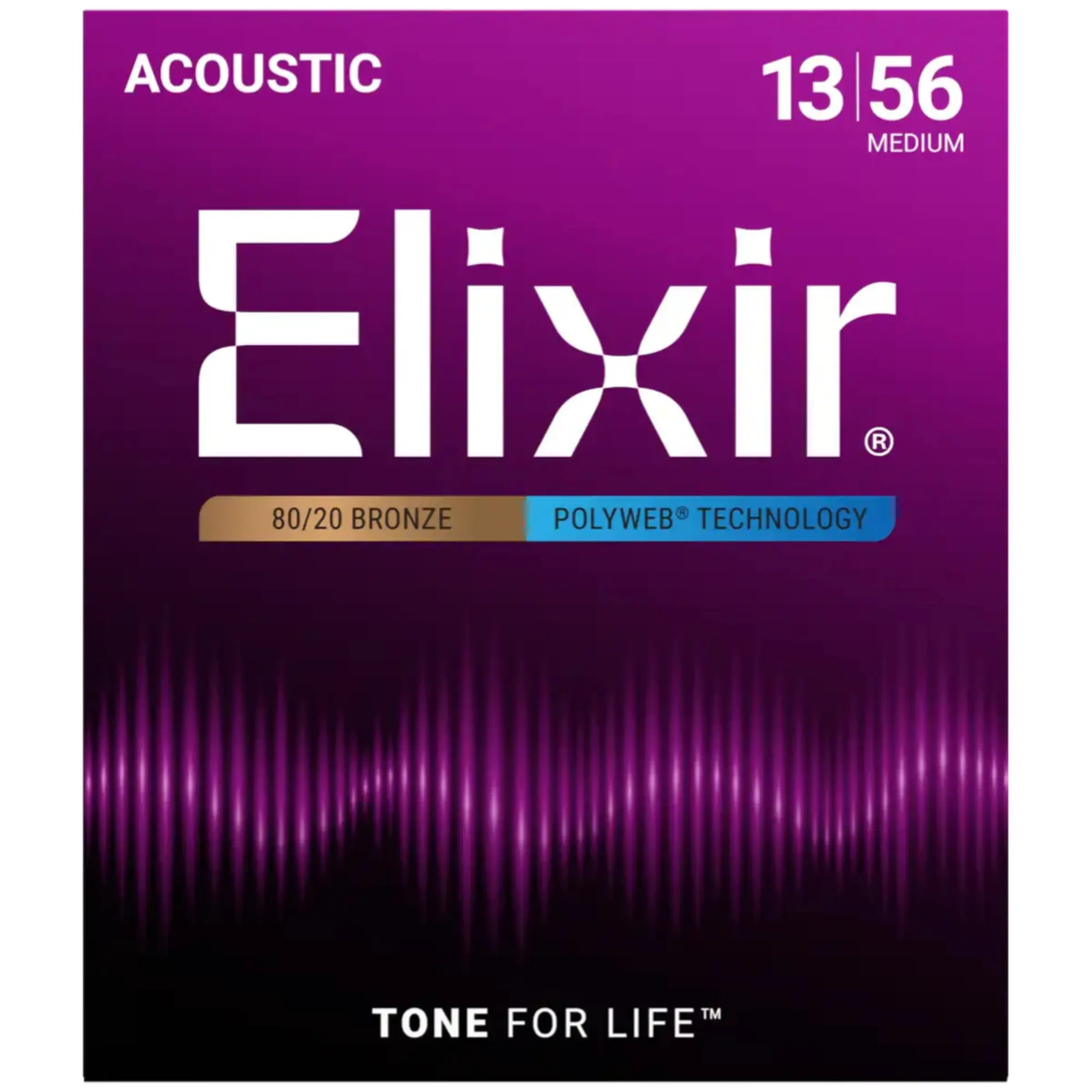Elixir Poly Web Acoustic Guitar Strings, here in Medium 13-56 gauge, have the original Polyweb coating featuring the full-bodied sound of 'broken-in' strings while maintaining their balanced tone 3-5 times longer than regular strings. This gauge is considered "medium".