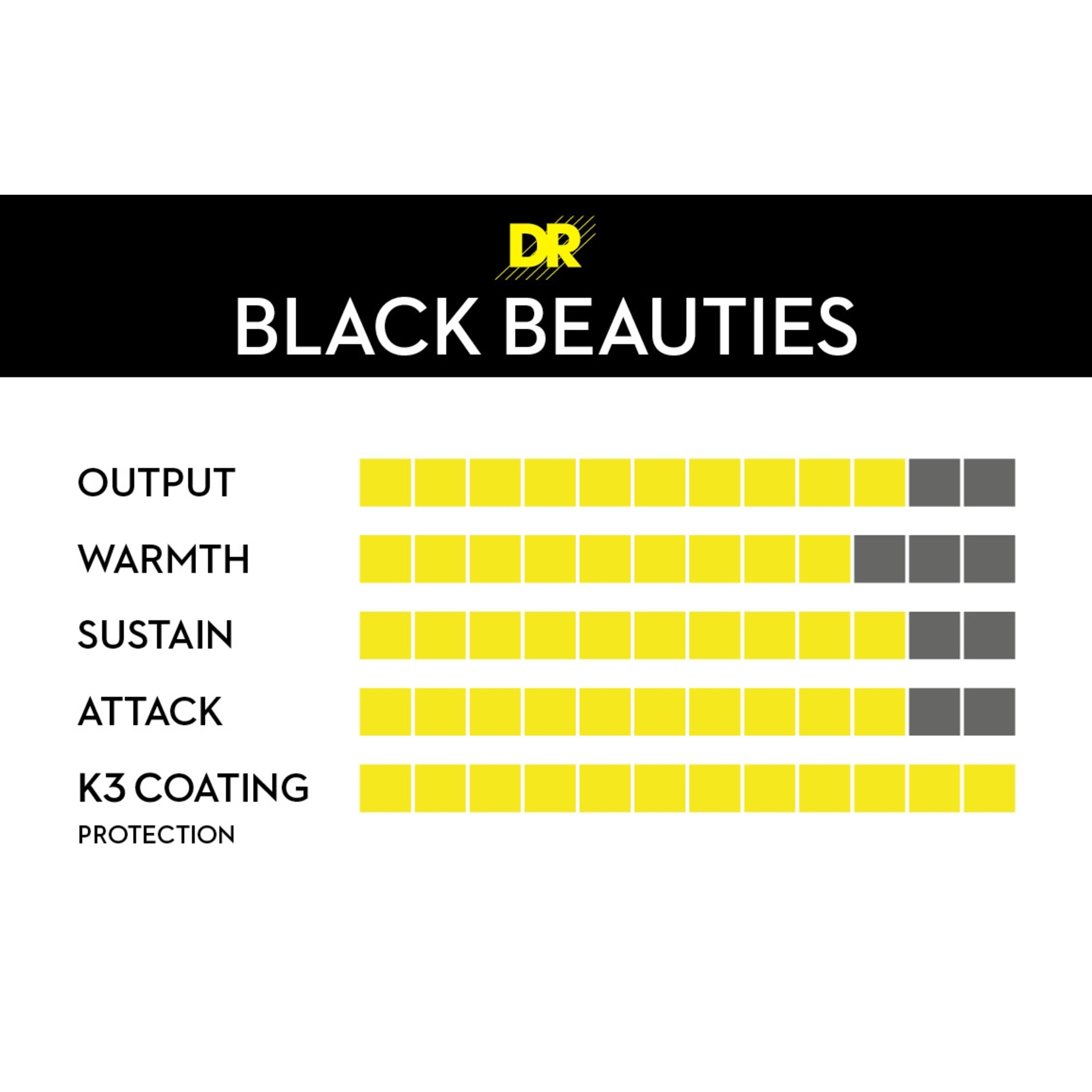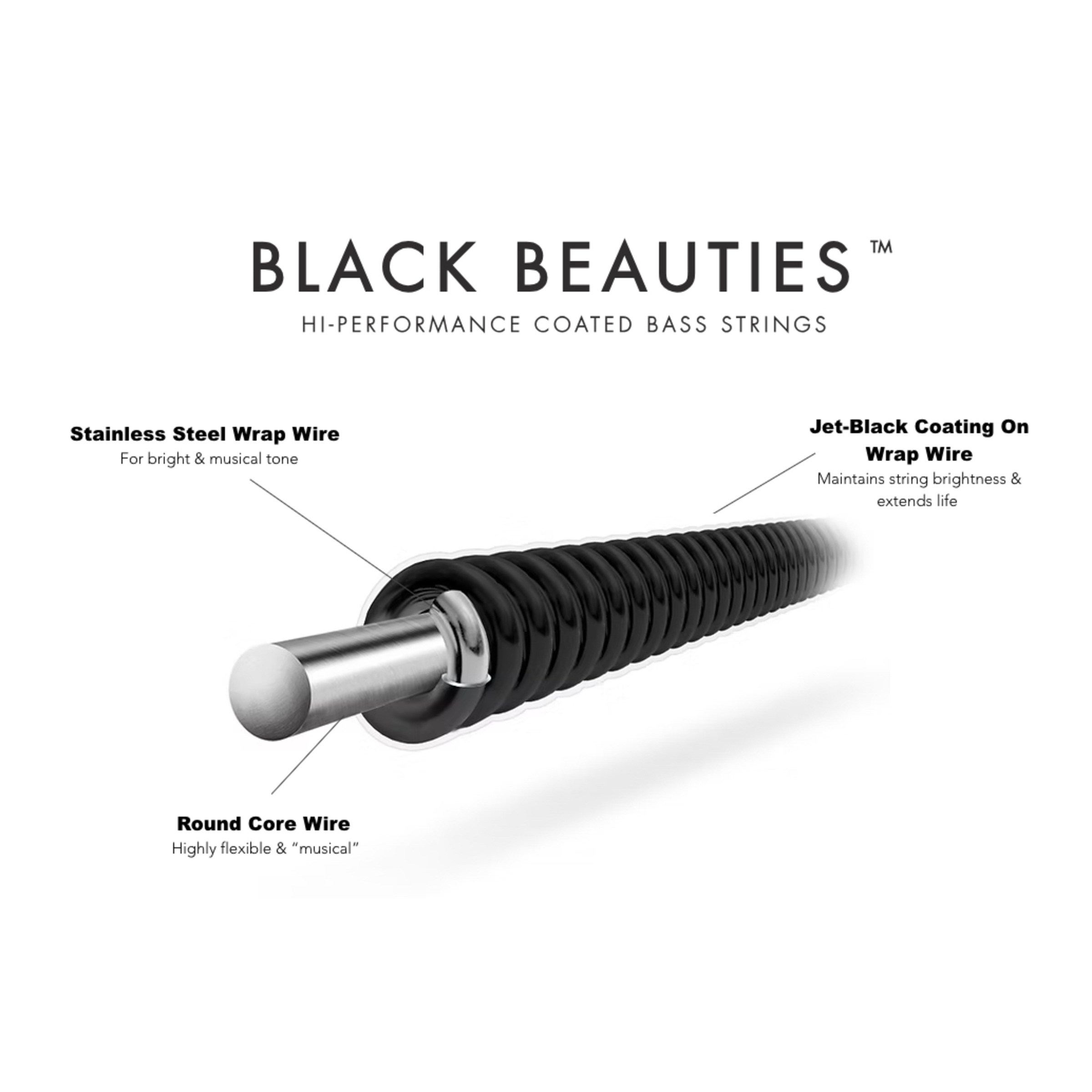 DR Black Beauties are black, coated bass strings that combine the musical advantages of a round core design with the protective features of DR’s proprietary K3 coating.