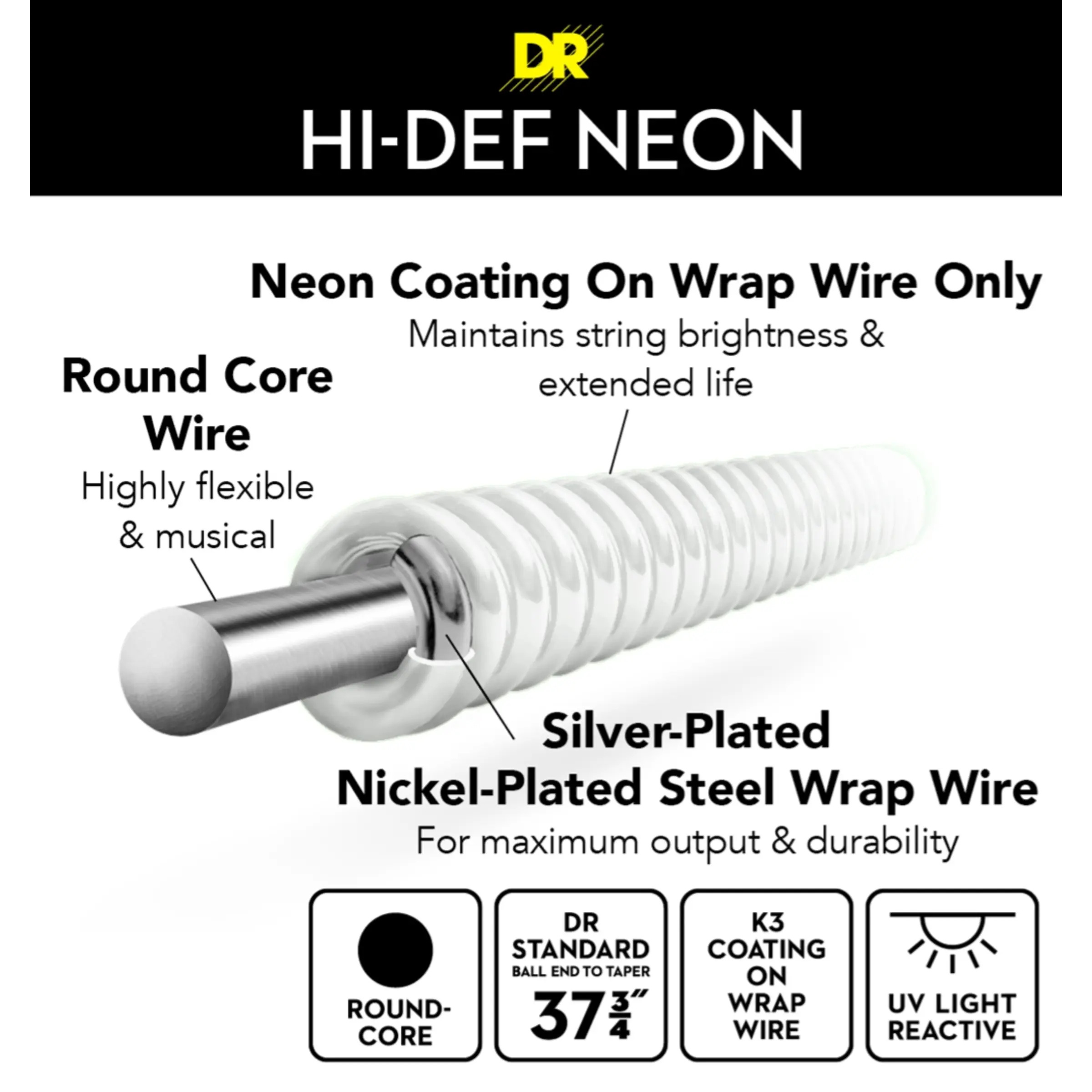 Transform your stage presence into a high-energy visual experience with DR Hi-Def Coated Bass Strings.